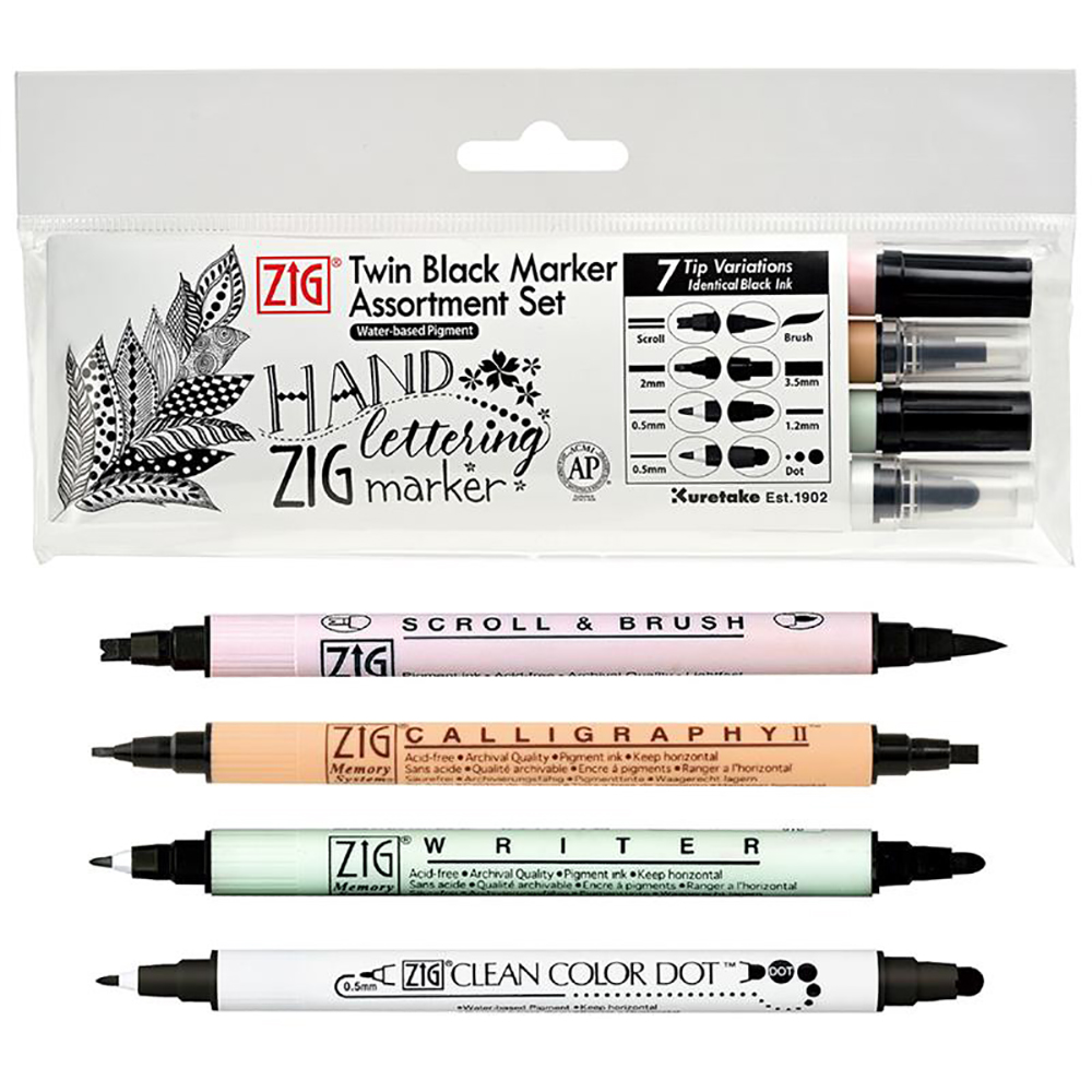 ペン先の形状が異なるブラックマーカー4本セット。レタリング、カリグラフィー、イラストはもちろん、様々なペン先を組み合わせたアートワークもお楽しみいただけます。